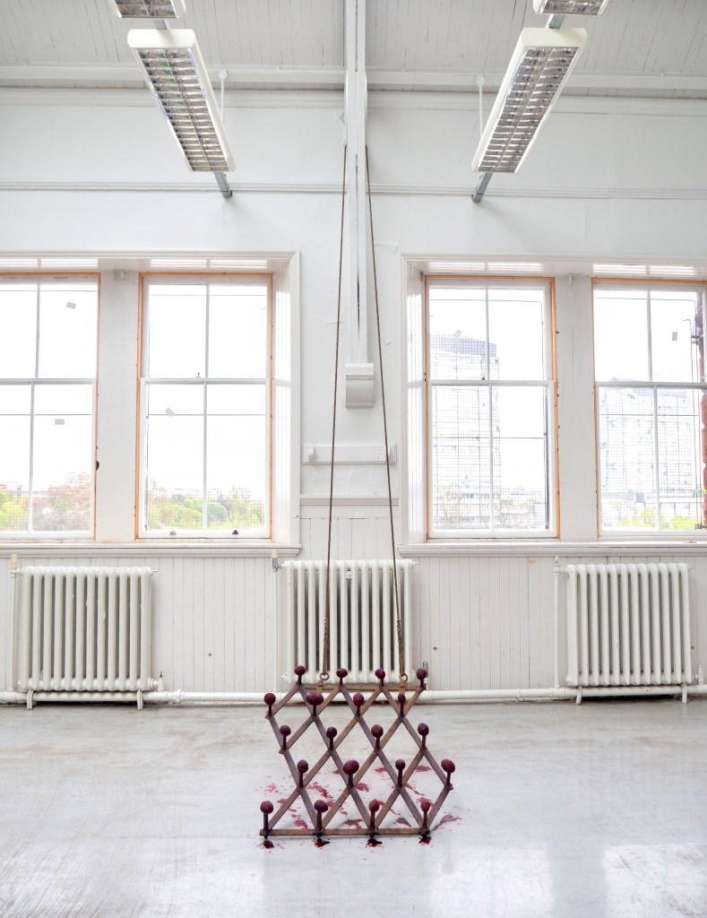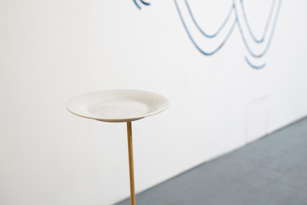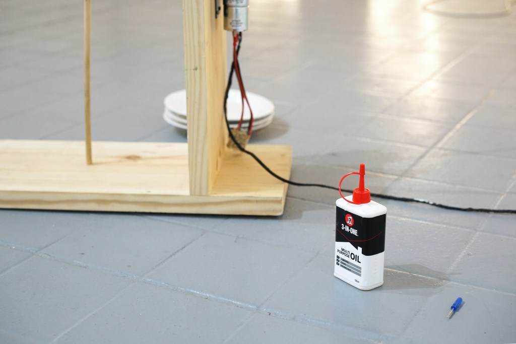 Fear Not (Machine), 2018 ceramic plates, wood, motor, 3-in-1 oil, screwdriver Detail of Fear Not (Machine)Detail of Fear Not (Machine)Fear Not (Machine)The Ultimate Liquid Dispensing System 3, 2016 mattress, chairs, PVC piping, pumps, condiment dispensers, scaffolding pole, milk, pumps